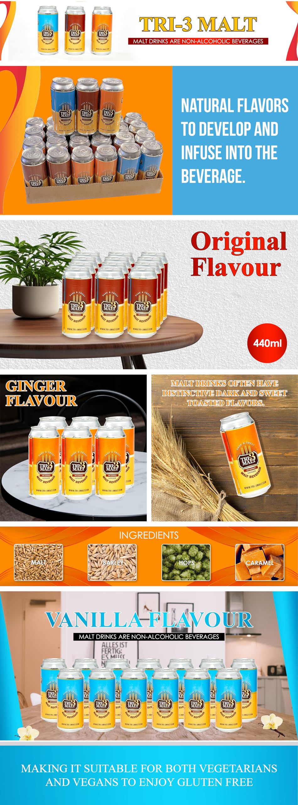 - TRI-3 Malt drinks with Original and Ginger flavors. Pack of 6 refreshing African best malt drink non-alcoholic pop soda beverages in UK. They are brewed with premium malted grains, barley, caramel, wheat, in water. TRI-3 Malt drinks often have distinctive dark and sweet toasted flavors. Ginger and Vanilla flavors in 440ml or 14oz cans. Perfect for parties. Free UK shipping over £50.